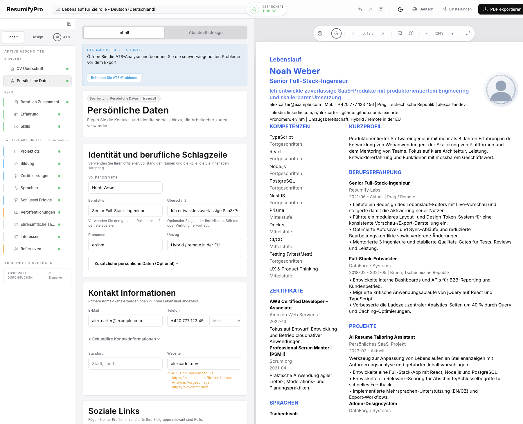 Erstellen Sie Lebensläufe, Anschreiben, Motivationsschreiben und Nachfassschreiben in einem durchgängigen Ablauf mit Live-Vorschau und zuverlässigem Export.